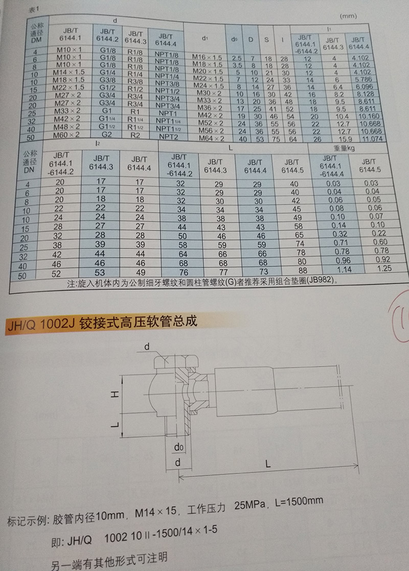 a)膠管內徑為DN6,連接螺紋d1=M18*1.5的錐密封膠管總成旋入端為公制細牙螺紋的錐接頭:錐接頭6-M18*1.5 JB/T  6144.1-92
